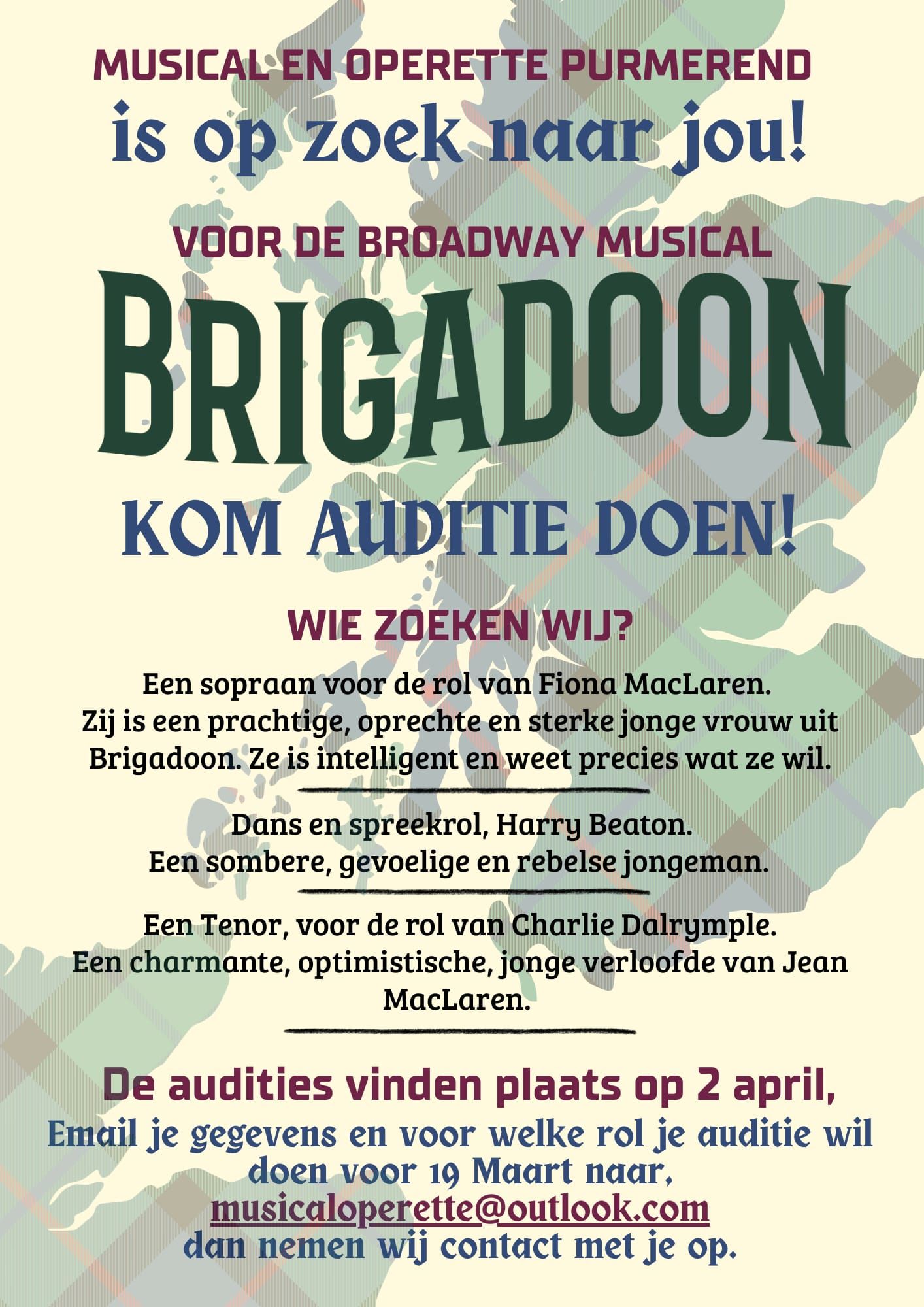 Voor de komende uitvoeringen van de Musical Brigadoon in november 2026 zijn wij op zoek naar de invulling van verschillende rollen zoals omschreven in bijgaande flyer.